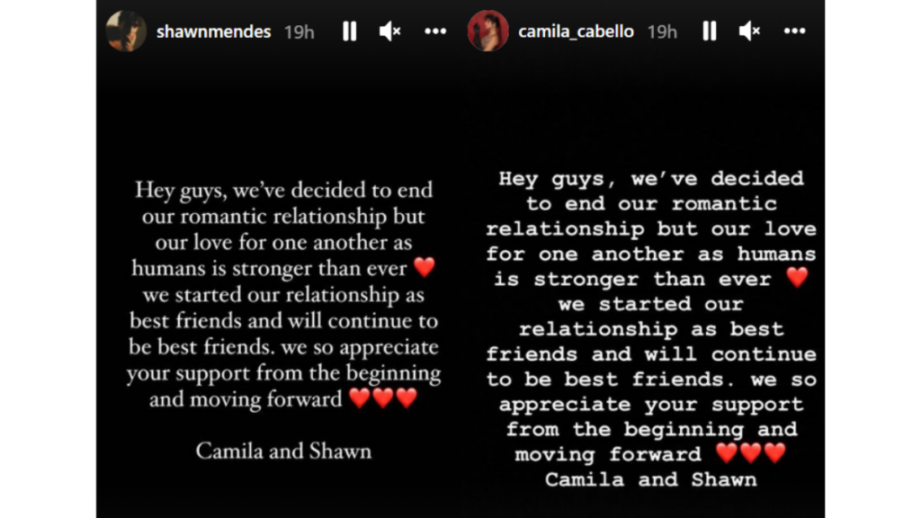 Հեյ՝ ժողովուրդ ջան, որոշում ենք կայացրել չշարունակել մեր ռոմանտիկ հարաբերությունները, բայց մեր սերը միմյանց հանդեպ որպես մարդ՝ առավել քան ուժեղ է։ Մենք սկսեցինք մեր հարաբերությունները որպես լավագույն ընկերներ ու շարունակելու ենք մնալ շատ – շատ մտերիմ։ Անչափ կարևորում ենք Ձեր աջակցությունն ամենասկզբից՝ մինչեւ հիմա։ Կամիլա ու Շոն