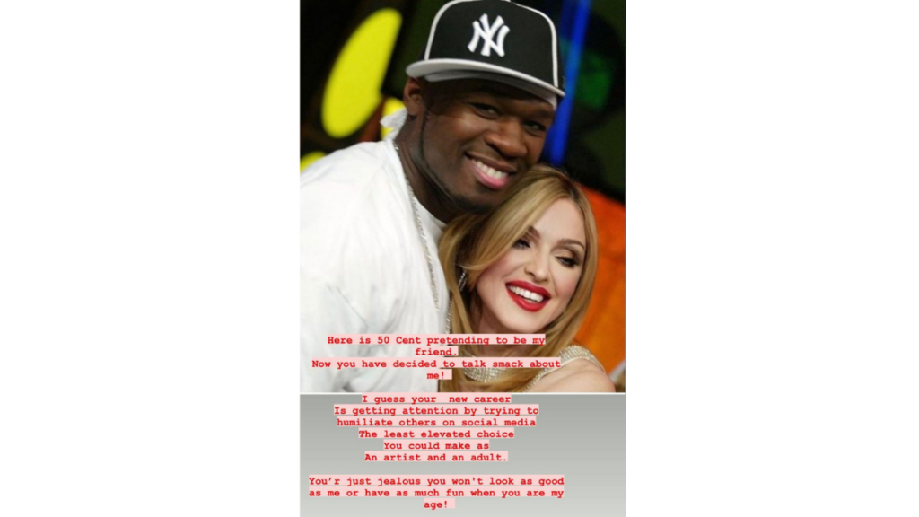 Մադոննան, ի պատասխան, Story հատվածում տեղադրել է ռեփերի հետ համատեղ լուսանկար ու գրառել՝ «Նայե՛ք 50 Cent- ին, որ իմ ընկերն էր ձևանում։ Հիմա որոշել ես կեղտ լցնել վրաս։ Ենթադրում եմ քո նոր գործունեությունը՝ մարդկանց սոց․ ցանցերում նսեմացնելն է։ Սա ամենացածր քայլ էր, որ կարող էիր անել թե՛ որպես արտիս, թե՛ որպես մարդ»։