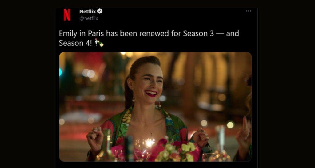 Netflix-ը երկարացրել է «Էմիլին Փարիզում» սերիալը երկու սեզոնով։ Այսպիսով՝ սերիալի սիրահարները հնարավորություն կուենան դիտել նաև երրորդ և չորրորդ սեզոնները։ Այս մասին լուրը հաստատել են Netflix- ի՝ Twitter-ի պաշտոնական էջում