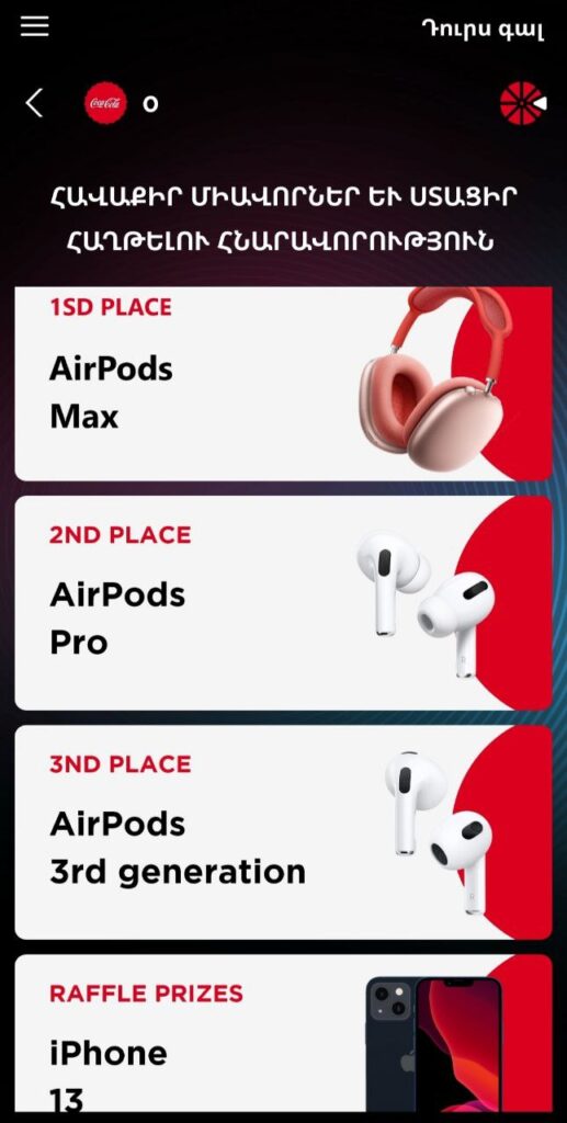 Յուրաքանչյուր օգտատեր հնարավորություն է ստանում շահելու հետեւյալ մրցանակները՝ Airpod pro max, Airpod pro, Airpod 3rd generation, JBL-ի դինամիկներ, iPhone 13։