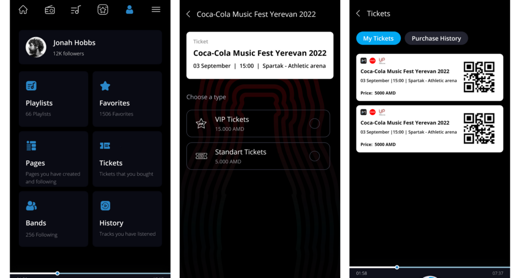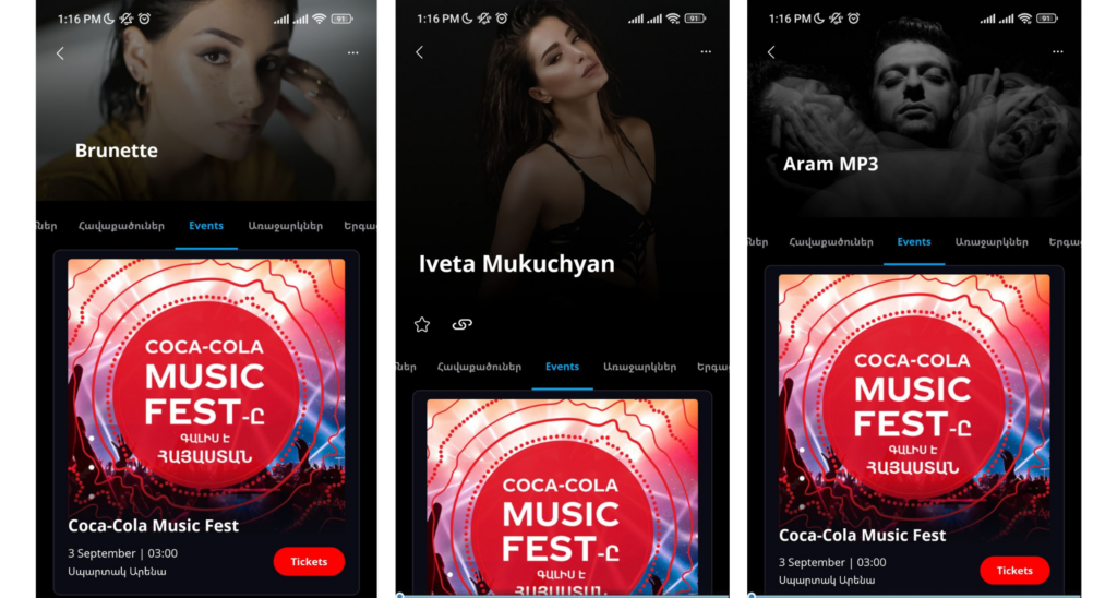 Այսպիսով՝ այսուհետ Հայաստանում տեղի ունեցող տարբեր միջոցառումների տոմսերը կարող եք ձեռք բերել հենց IMUSIC հավելվածով։ Միջոցառումներ հատվածում կարող եք տեսնել հասանելի իրադարձությունն ու ձեռք բերել տոմսը։