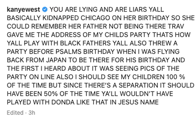 «Ստում եք, բոլորդ ստախոս եք. առևանգել եք Չիկագոյին իր ծննդյան օրը, որպեսզի նրա մեջ տպավորվի, որ իր հայրն այդ օրը իր հետ չէր», պատասխանել է Քանյեն։ Քլոեն իր հերթին նշել է, որ Քանյեն միշտ գիտի, թե որտեղ են իր երեխաները, և որ որևէ մեկը երբևէ իր երեխաներին չի թաքցրել իրենից։