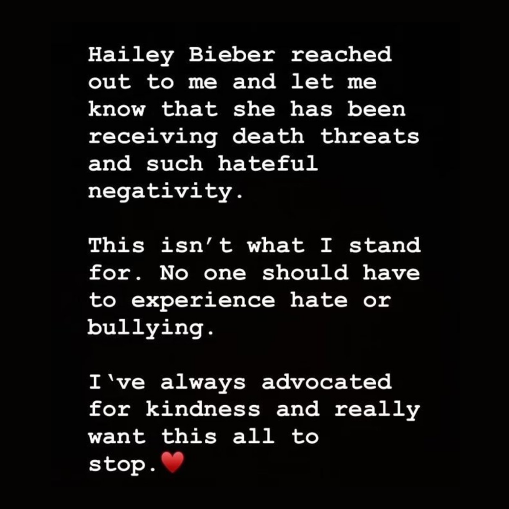 «Հեյլի Բիբերը կապվեց ինձ հետ և ասաց, որ ինքը մահվան սպառնալիքներ և այլ բացասական հաղորդագրություններ է ստացել: Նման վարքի հավանություն չեմ տալիս: Ոչ ոք չպետք է դառնա ատելության կամ ահաբեկման զոհ: Միշտ պաշտպանել եմ բարությունը և իսկապես ուզում եմ, որ այս ամենը դադարի, – գրել է նա։