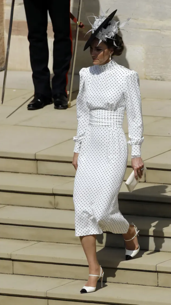 Քեյթ Միդլթոնն ընտրել էր Alessandra Rich-ի կետավոր զգեստ, Philip Tracy գլխարկ և ականջօղեր, որոնք նախկինում պատկանել են արքայադուստր Դիանային: