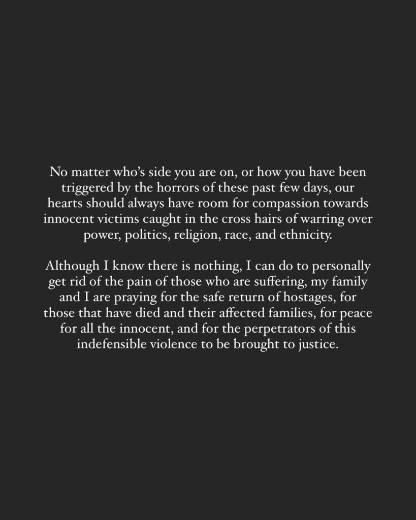 «Ուղերձ իմ հրեա ընկերներին և ընտանիքներին: Ես սիրում եմ ձեզ: Ես աջակցում եմ ձեզ: Լսել եմ, թե որքան վախեցած եք այս ընթացքում, և ուզում եմ, որ իմանաք, որ մենակ չեք այս հարցում», – գրել է Քիմը: «Իմ սիրտը ցավում է՝ տեսնելով այս երեխաների և ընտանիքների տեսագրությունները, որոնք ահաբեկվում և սպանվում են ամբողջ աշխարհի աչքի առջև»: